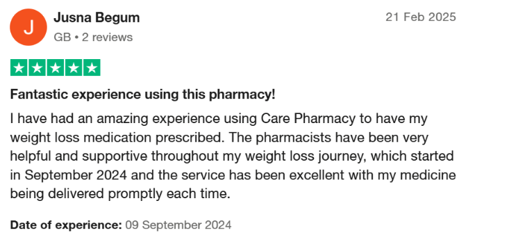 “I have had an amazing experience using Care Pharmacy to have my weight loss medication prescribed. The pharmacists have been very helpful and supportive throughout my weight loss journey, which started in September 2024, and the service has been excellent with my medicine being delivered promptly each time.” Jusna Begum