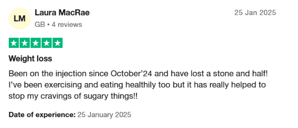 “Been on the injection since October ’24 and have lost a stone and a half! I’ve been exercising and eating healthily too, but it has really helped to stop my cravings for sugary things!!” – Laura MacRae