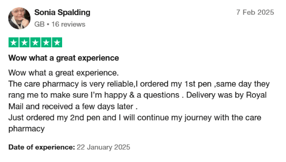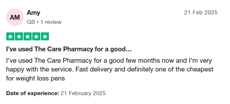 “I’ve used The Care Pharmacy for a good few months now, and I’m very happy with the service. Fast delivery and definitely one of the cheapest for weight loss pens.” Amy