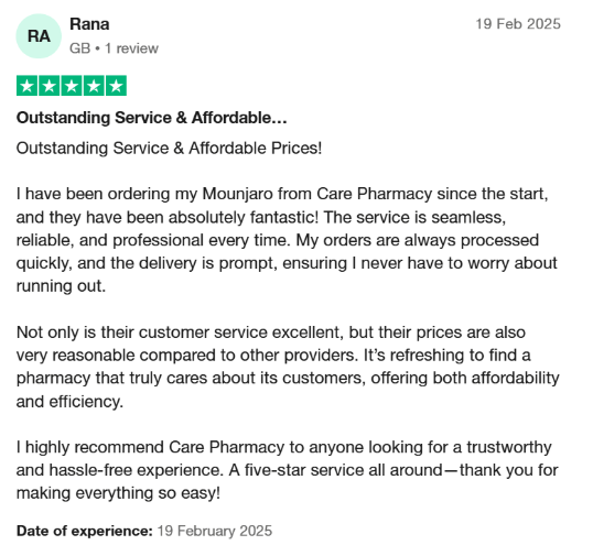 “I have been ordering my Mounjaro from Care Pharmacy since the start, and they have been absolutely fantastic! The service is seamless, reliable, and professional every time. My orders are always processed quickly, and the delivery is prompt, ensuring I never have to worry about running out.