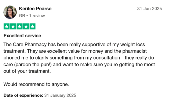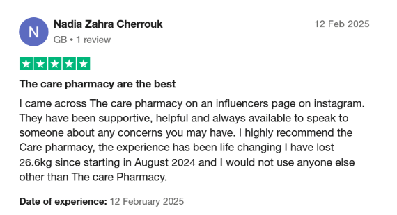 The Care Pharmacy distinguishes itself through exceptional customer service, competitive pricing, and personalised care. Patients consistently report satisfaction with the pharmacy’s prompt deliveries, supportive staff, and effective communication channels, including live chat services and personal phone calls when necessary. This dedication ensures that patients feel supported throughout their weight loss journey.