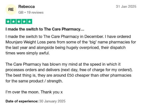 “I made the switch to The Care Pharmacy in December. I have ordered Mounjaro Weight Loss pens from some of the ‘big’ name pharmacies for the last year, and alongside being hugely overpriced, their dispatch times were simply awful.